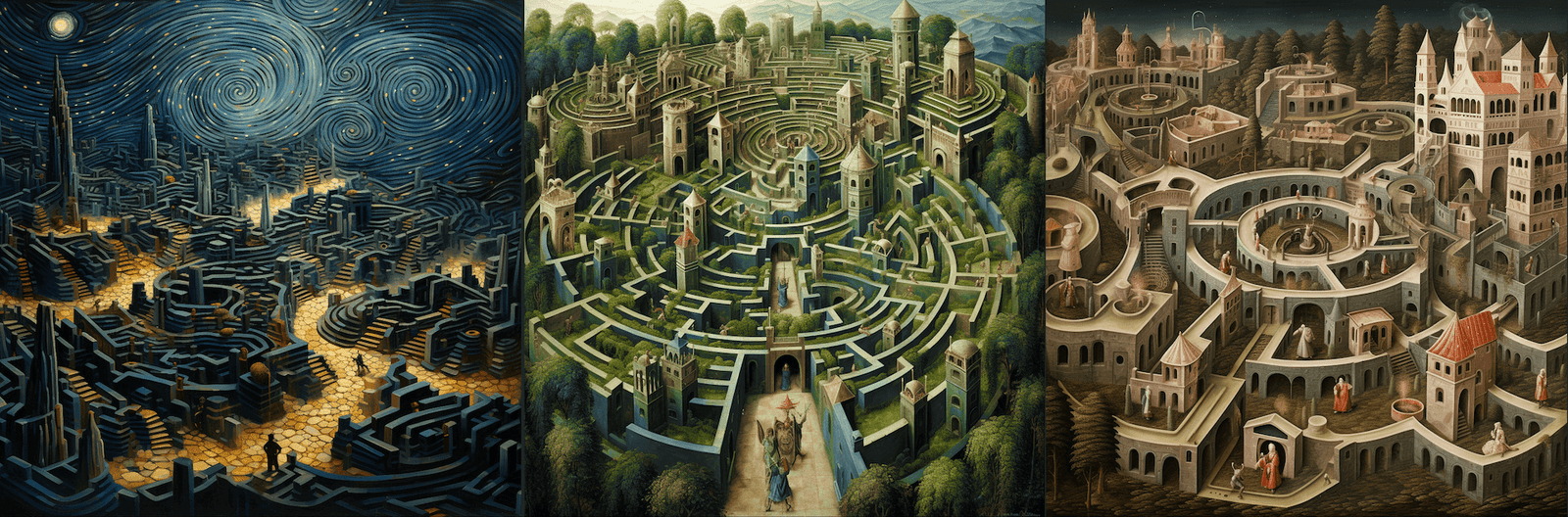 Three labyrinths, archetypal symbols for mind and complex systems problem-solving.